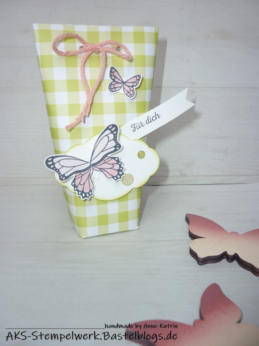 Die Schmetterlinge sind aus dem Stempelset „Schmetterlingsglück“ und mit der passenden Handstanze (beides gibt es aktuell noch im Sparpaket, S. 35 im Frühjahr-Sommerkatalog) ausgestanzt.