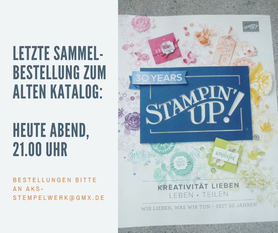 Denk heute Abend an meine letzte Sammelbestellung zum alten Jahreskatalog, wenn Du noch ein paar alte Sets ergattern möchtest oder Materialien, die ab 4. Juni dann im Preis ein bißchen ansteigen (das gilt vorallem für Papier) 😉