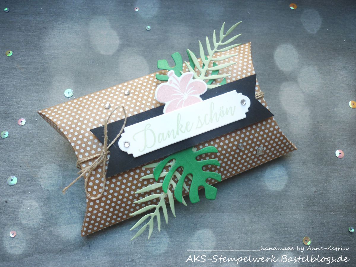 Ich habe nämlich eine unserer Pillowboxen, die Du fertig im 10er-Pack (Jahreskatalog S. 172) bestellen kannst, aufgehübscht.
