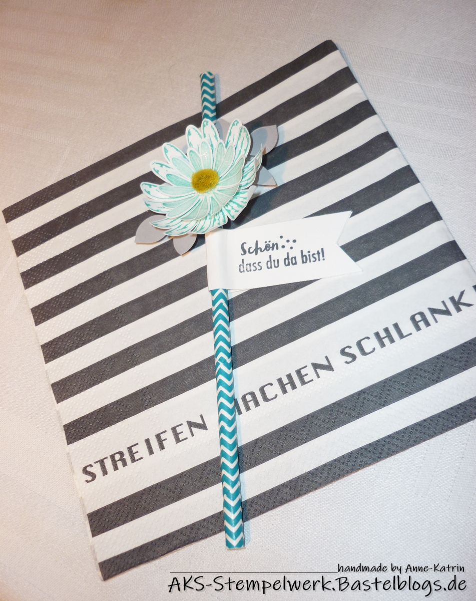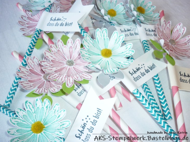 Die bunten Papierstrohhalme passten farblich super und so habe ich mit rokoko-rosa und bermudablau ein paar Gänseblümchen gestempelt und dann ausgestanzt und in mehreren Lagen übereinander geklebt.