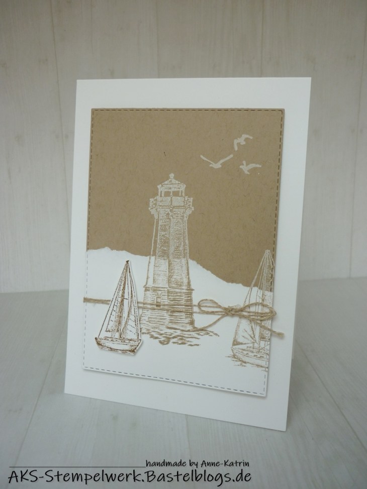 Dafür habe ich endlich mal den Stamparatus bemüht und das Leuchtturm-Motiv und das große Segelboot einmal in savanne auf flüsterweis gestempelt und einmal in craft weiß auf savanne.