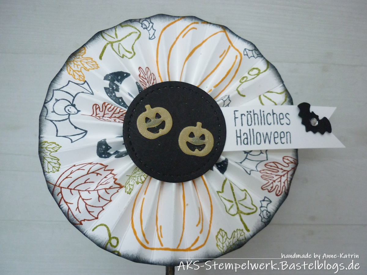 Der gestickte Kreis in schwarz ist mit den Stanzformen „Stickmuster“ aus dem Hauptkatalog S. 196 ausgestanzt und die niedlichen Kürbisse findet Ihr bei den Stanzformen „Anhängertrio“ (Herbstwinterkatalog S. 56).