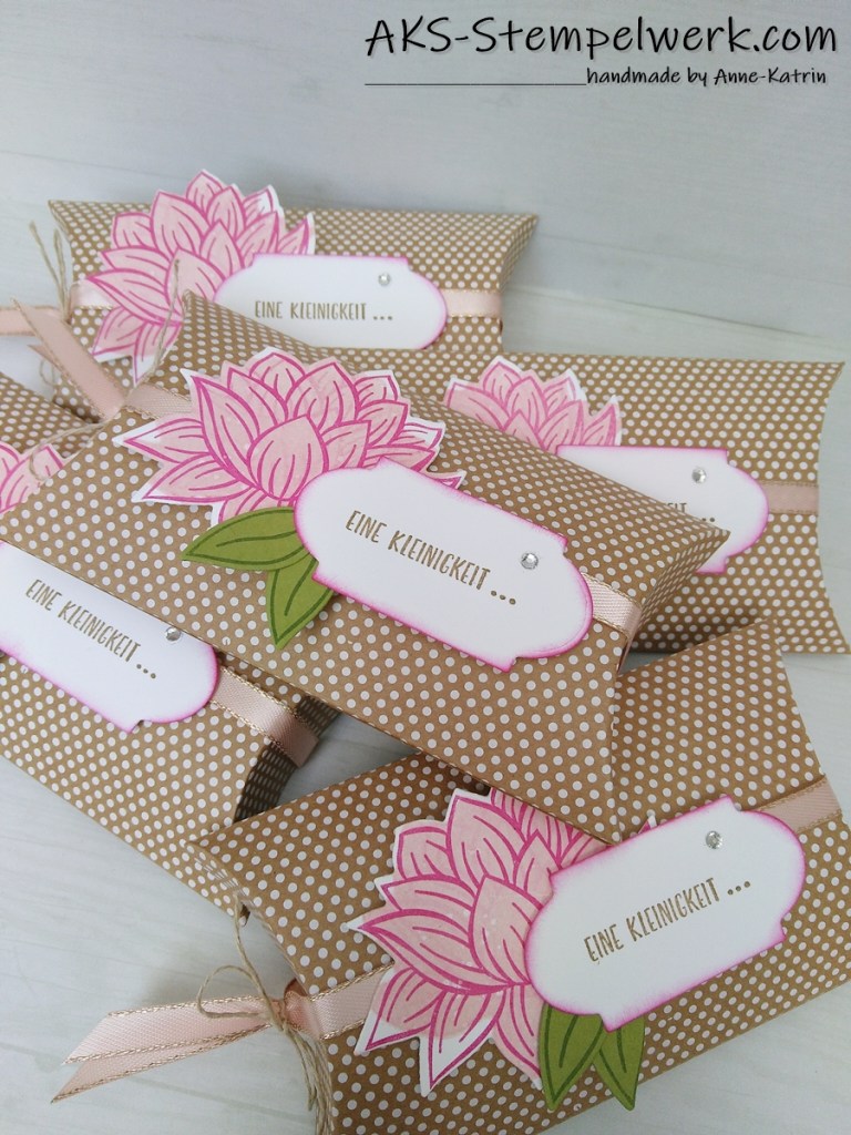Die sandfarbenen Kissenschachteln kennt Ihr ja aus dem Hauptkatalog (S. 172), genauso wie den Leinenfaden (S. 173). Das hübsche Geschenkband in blütenrosa mit Metallickante findet Ihr im Frühjahr-Sommerkatalog (S. 15).