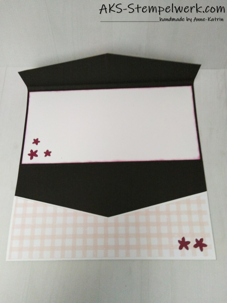 Von den Maßen her ist diese Tasche genau der Teil, der am oberen Rand vom DIN A4-Bogen abgeschnitten ist, um diese Umschlagform mit der Spitze hinzukriegen. Allerdings habe ich hier nicht nochmal schwarzen Cardstock verwendet, sondern das weiße Pendant und dann auch mit dem Designerpapier beklebt.
