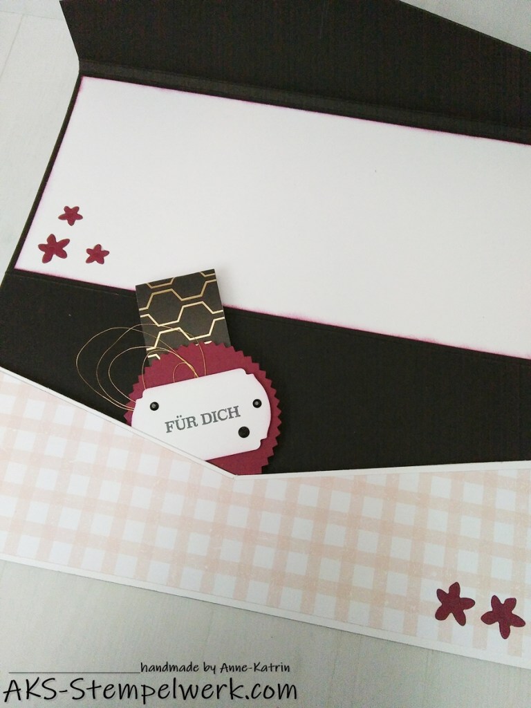 Der Geburtstagsgruß ist mit merlotrot gestempelt und mit der Schere einfach ausgeschnippelt. Er stammt aus dem Stempelset „Zum Geburtstag für Dich“ aus der SAB. Genauso wie das Für Dich vorne auf der Banderole, die ich als Verschluss für diese Kartenform genommen habe.