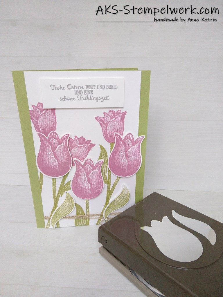 Und passend dazu möchte ich Euch diese frühlingshafte/österliche Karte mit dem Set Tulpengrüße zeigen, die wir als Make and Take gewerkelt haben.