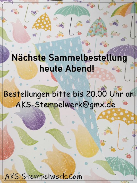 Wer von Euch noch an meiner heutigen SU-Sammelbestellung teilnehmen möchte, kann mir bis 20.00 Uhr seine Wünsche per E-Mail schicken an:
