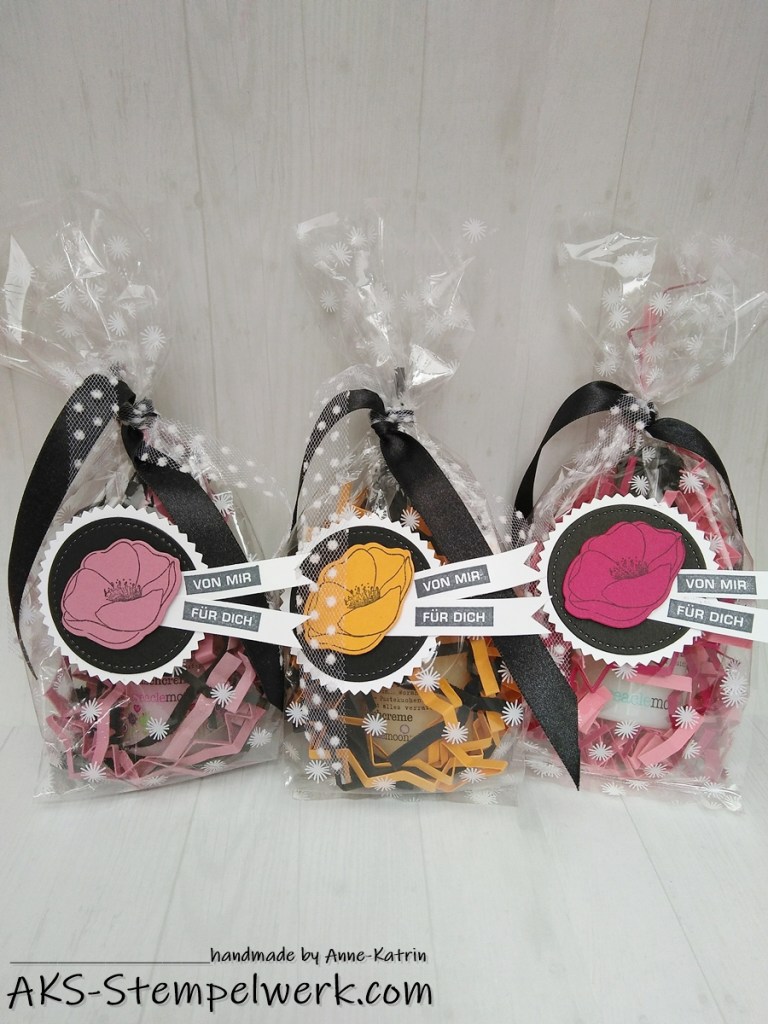 Verwendet habe ich dafür die neuen bedruckten Zellophantüten aus dem Frühjahr-Sommerkatalog (S. 33), die mit dem Satinband in schwarz und dem gepunkteten Tüllband in flüsterweiß (beides Hauptkatalog S. 175) verschlossen sind.