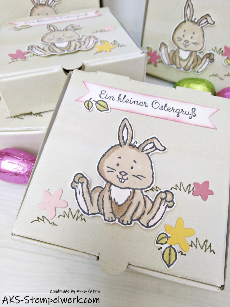 Der süße Hase stammt aus dem Set „Osterschatz“ (Frühjahr-Sommerkatalog S. 45), genauso wie der Spruch, das Gras und die Blätter. Das Set ist wirklich super.