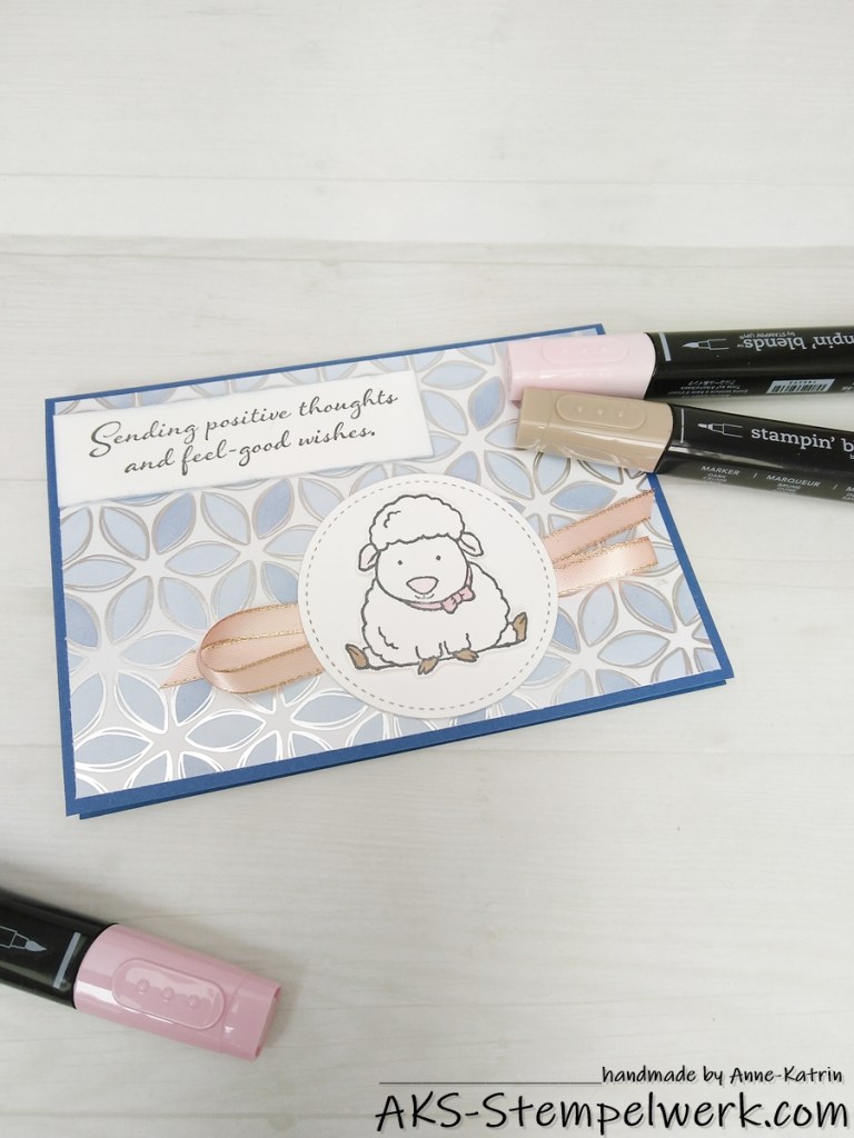 Coloriert habe ich mit den Stampin‘ Blends, das Geschenkband in blütenrosa mit Metallic-Kante ist aus dem Frühjahr-Sommerkatalog (S. 15) und als Hintergrund für das ausgeschnittene Schaf habe ich die Stanzformen Stickmuster (Hauptkatalog S. 196) verwendet.