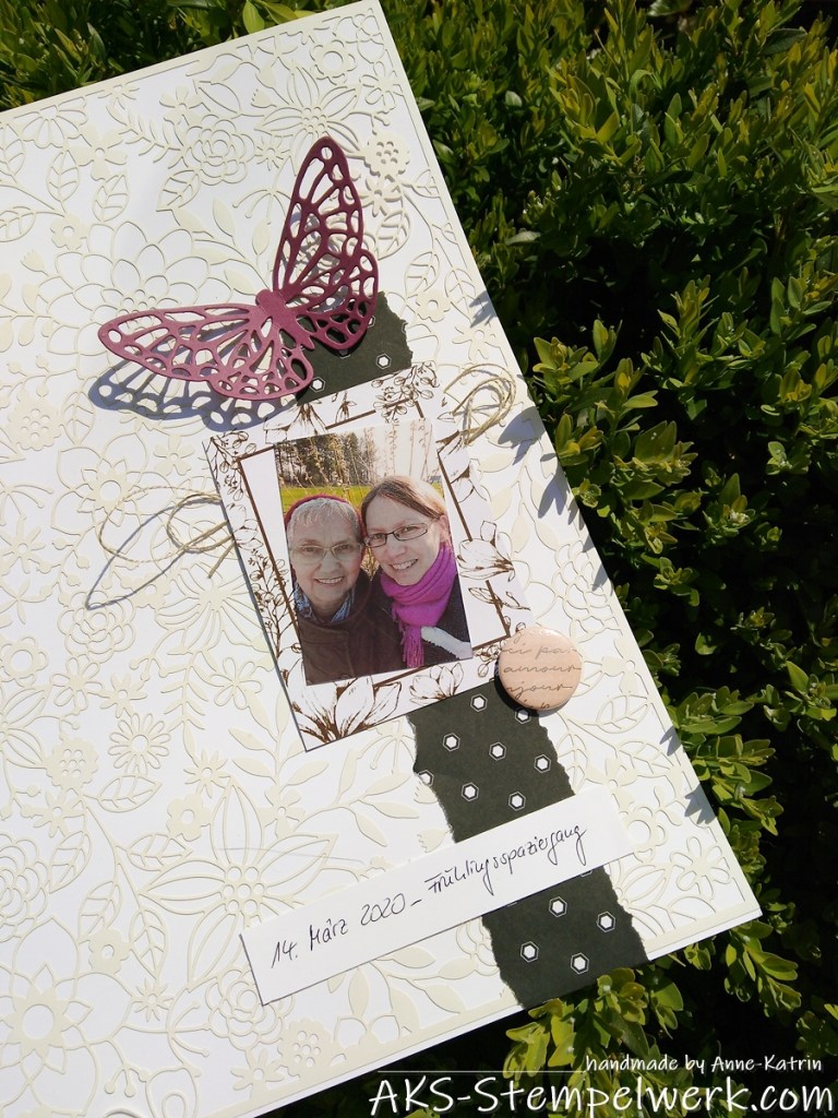 Der Hintergrund für’s Foto ist aus dem „Kartensortiment Erinnerungen und mehr – Magnolienweg“ (Hauptkatalog S. 37). Dahinter verbirgt sich ein bißchen Leinenfaden (Hauptkatalog S. 173).