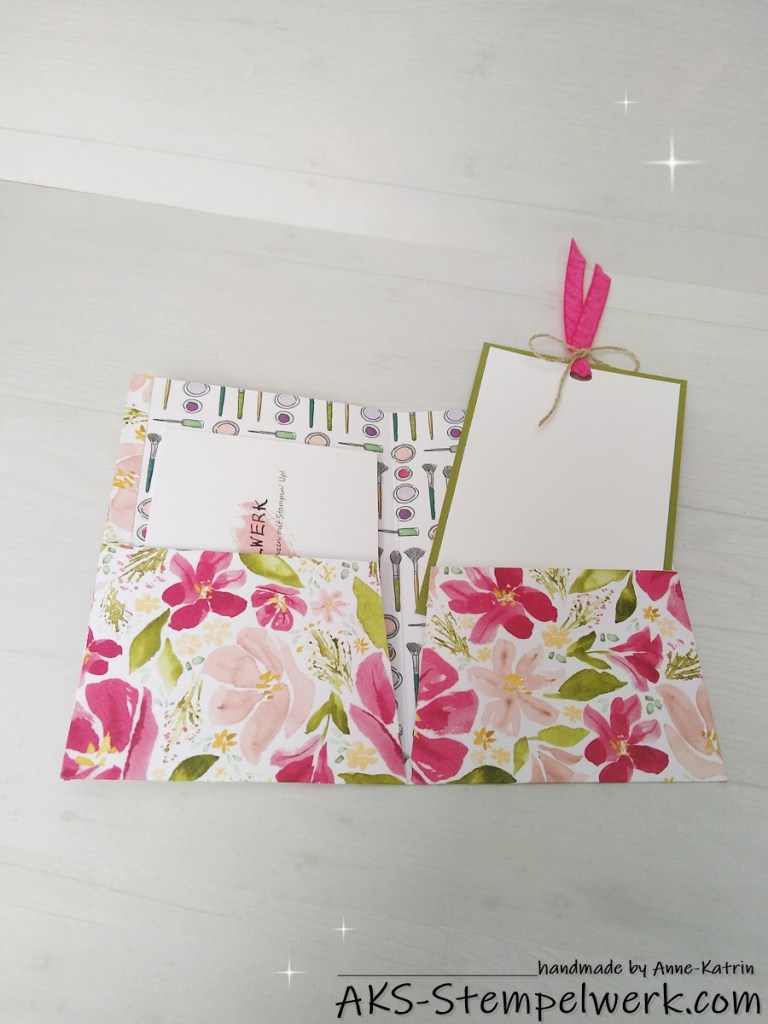 Statt Gutscheine habe ich links meine Visitenkarte hinein gesteckt – die passen nämlich auch perfekt in das kleine Fach – und auf der anderen Seite bleibt noch Platz für einen kleinen persönlichen Gruß.