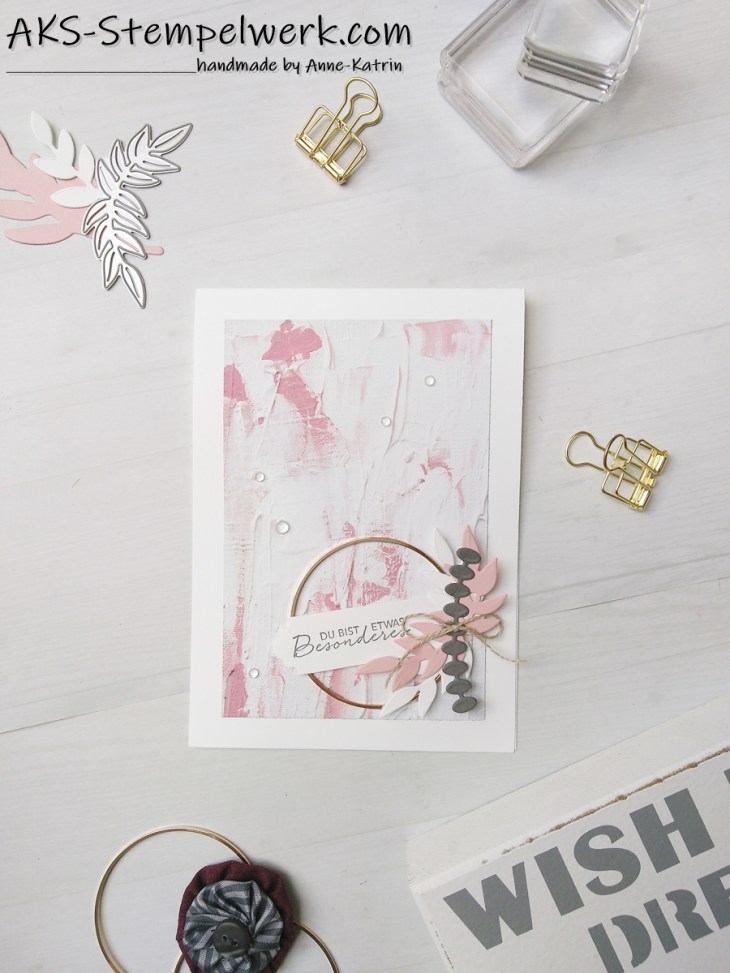 Natürlich wollte ich auch die neuen „Accessoires Goldreif“ (S. 156) ausprobieren und habe dazu noch ein paar Stanzformen aus dem Set „Ewige Zweige“ (S. 175), das zum Produktpaket „Für alle Zeit“ gehört, kombiniert. Farblich passend in weiß, kirschblüte und anthrazit.
