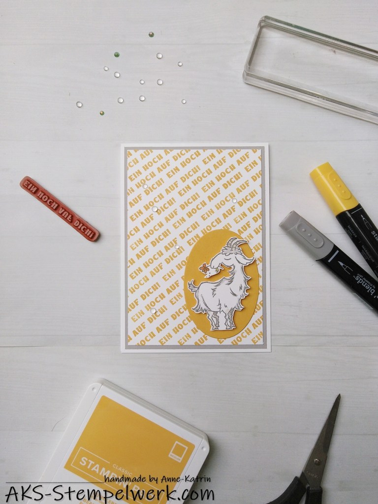 Das ovale Etikett – natürlich auch in hummelgelb – stammt aus den Stanzformen „Lagenweise Ovale“ (Jahreskatalog S. 181) und die süße Ziege findet Ihr natürlich in dem neuen Stempelset „Nix zu meckern“ (Jahreskatalog S. 105). Das Set ist einfach der Knüller und macht jedes mal, wenn ich es sehe, gute Laune!