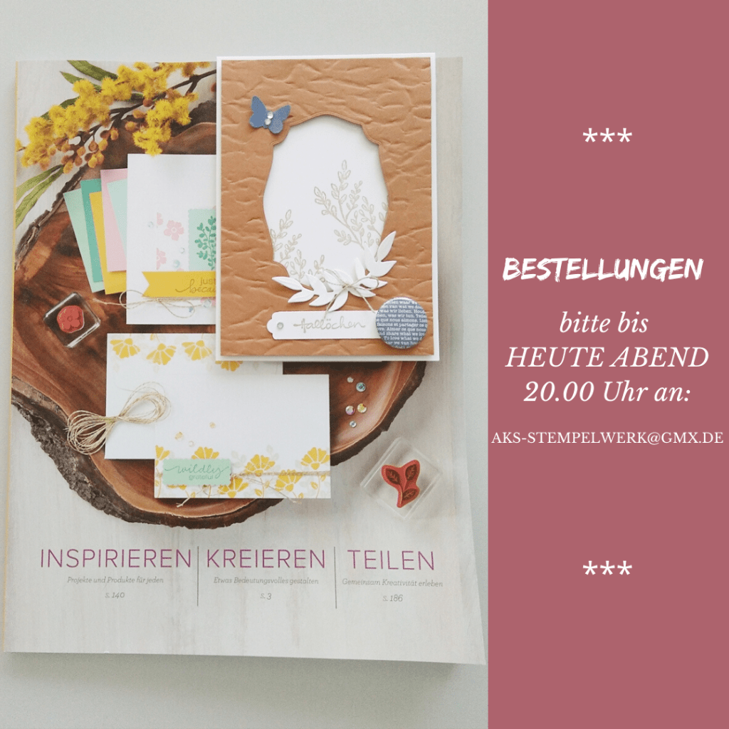 Wer inzwischen seine Wunschliste aus dem neuen SU-Katalog fertig hat, kann mir die gerne bis heute Abend 20.00 Uhr für die nächste Sammelbestellung schicken und so Porto sparen oder ein kleines Danke-Goodie einheimsen. 🙂