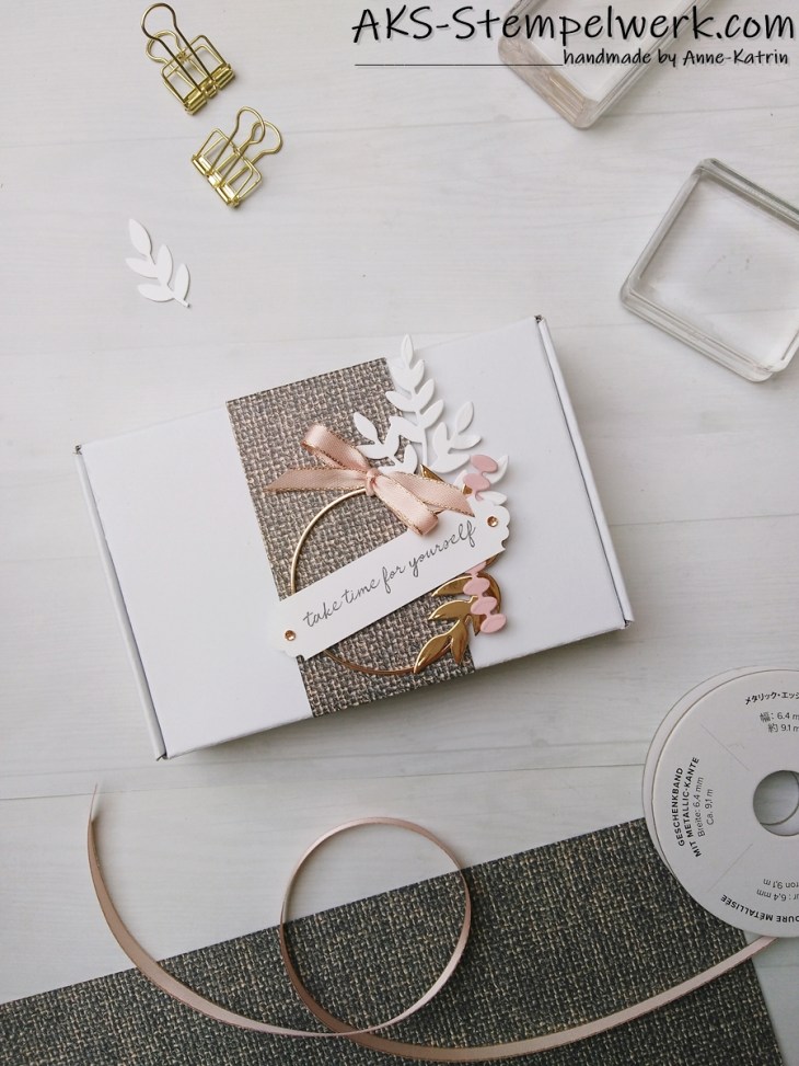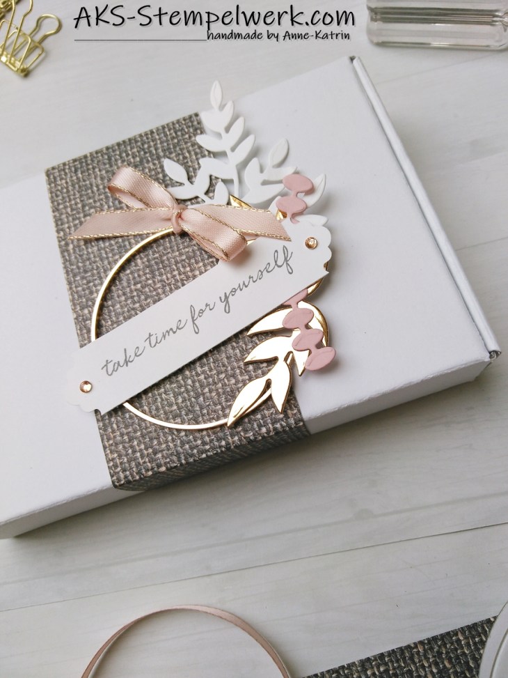 Ein bißchen flüsterweiß, ein bißchen rose und das Metallic Folienpapier in Messing, das neu im Sortiment ist. (S. 153)