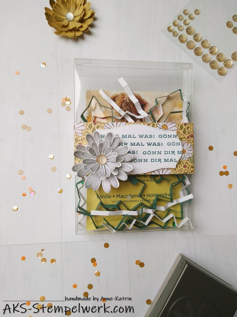 Ich habe nämlich ein schönes Badesalz in den „Azetatschachteln“ von S. 152 verpackt, mit ein paar Pailletten und gefalteten Streifen Cardstock aufgefüllt und dann mit einer Banderole verziert.