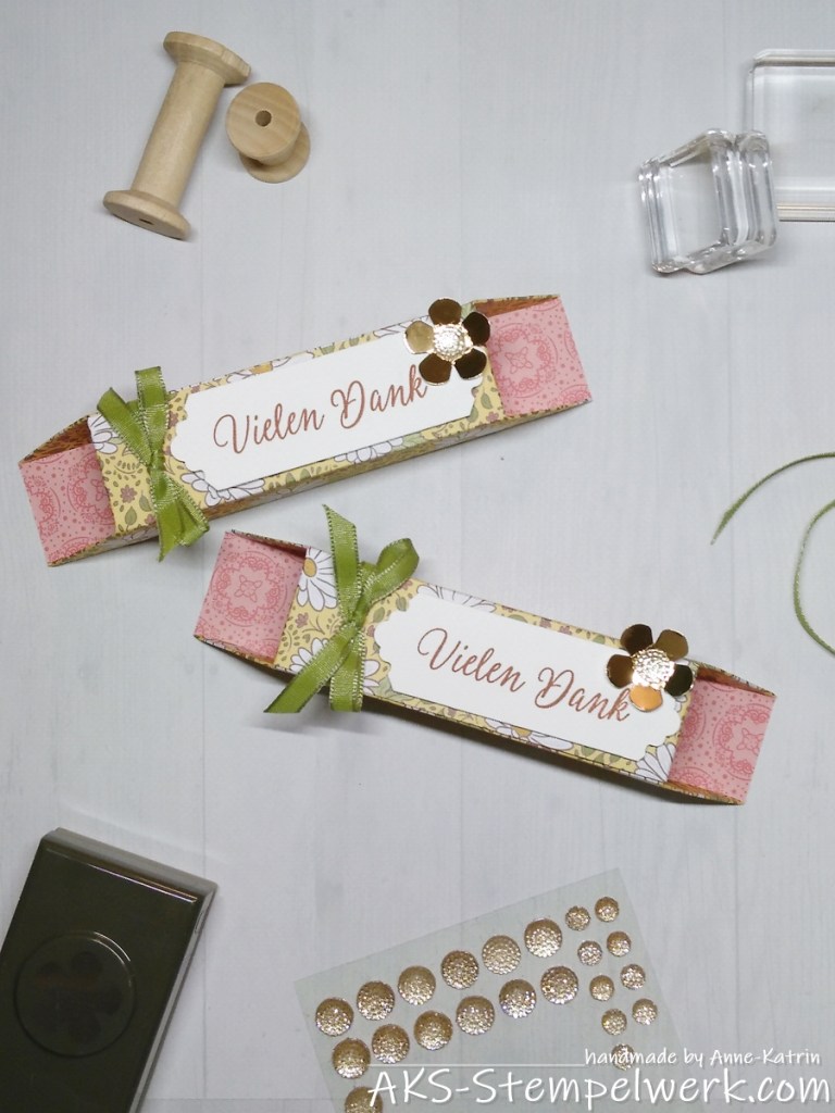Diese kleinen Verpackungen sind mit dem Designerpapier „Schöner Garten“ (Hauptkatalog S. 149) gemacht. Ich finde, das passt perfekt zu dem aktuellen, sommerlichen Wetter, oder?
