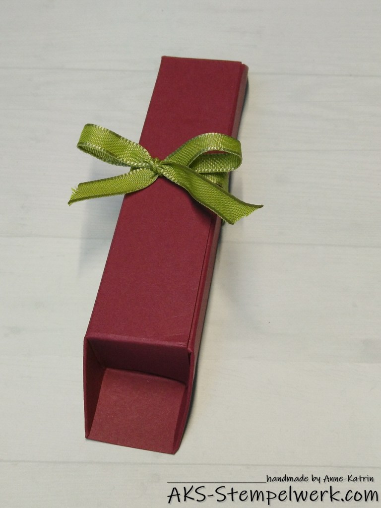 Da Ihr ja für diese Box wirklich keinen Kleber benötigt, habe ich zum Abschluss einfach noch ein Schleifchen drum gebunden. (Hauptkatalog S. 160) Sicher ist sicher, beim Transportieren 😉
