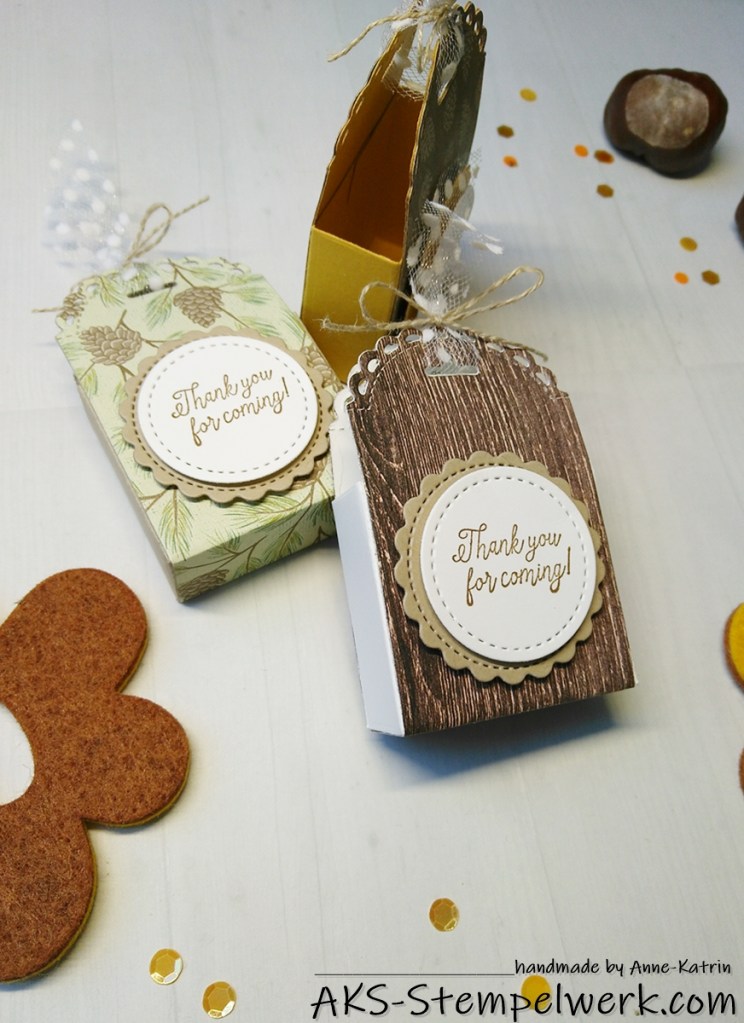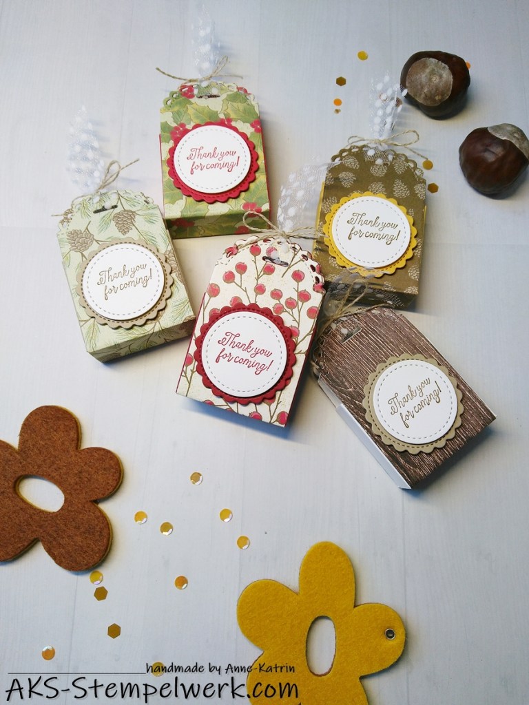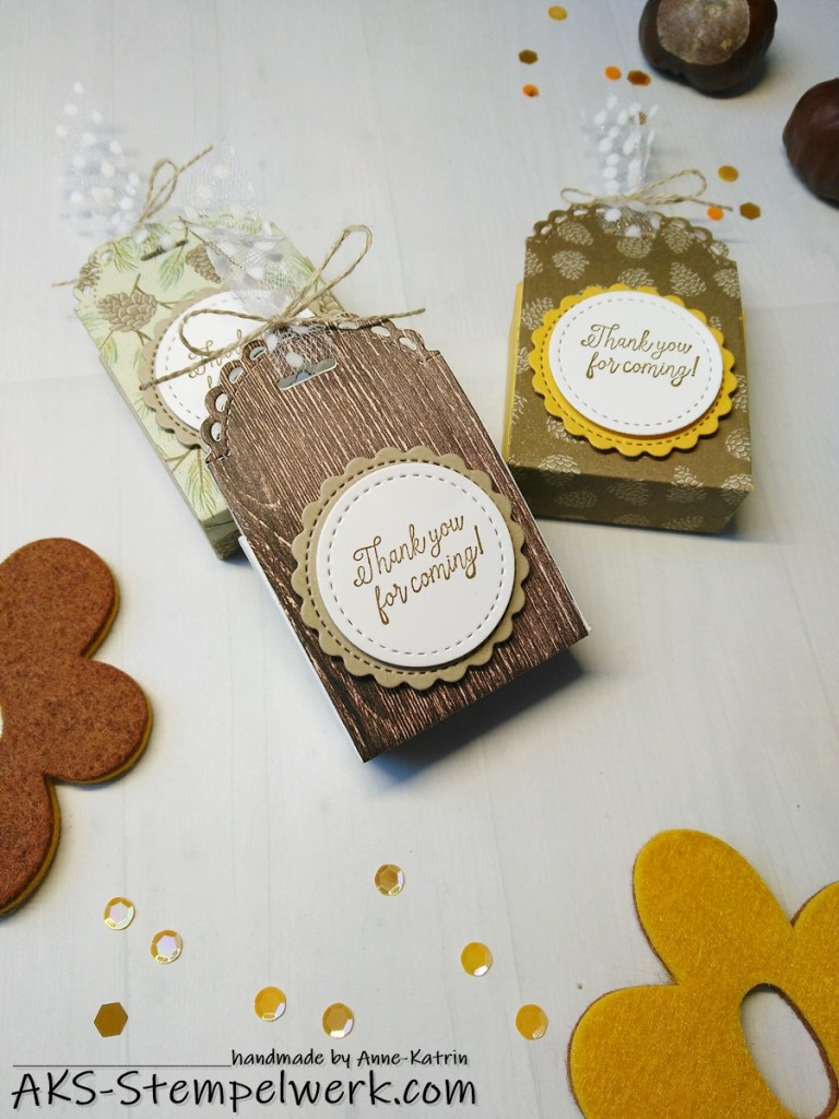 Als Willkommensgoodies habe ich neulich diese süßen Täschchen gewerkelt mit der Stanzform „Mini-Geschenkschachtel“ (Herbst-Winterkatalog S. 70).