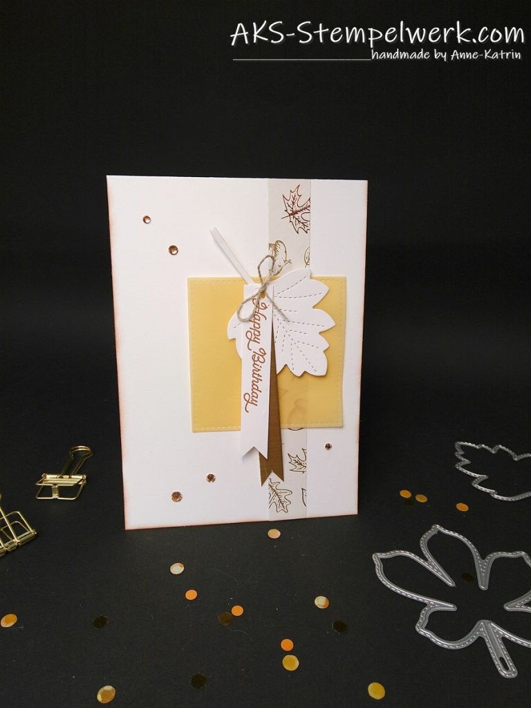 Das Blatt ist wieder mit meinen heißgeliebten Stanzformen „bestickte Blätter“ (Herbst-Winterkatalog S. 49) gemacht, die beiden Fähnchen sind per Hand ausgeschnitten. Der Spruch stammt aus dem Stempelset „Postet for you“ (Hauptkatalog S. 81); ich mag die Sprüche und auch die geschwungene Schrift total gerne.