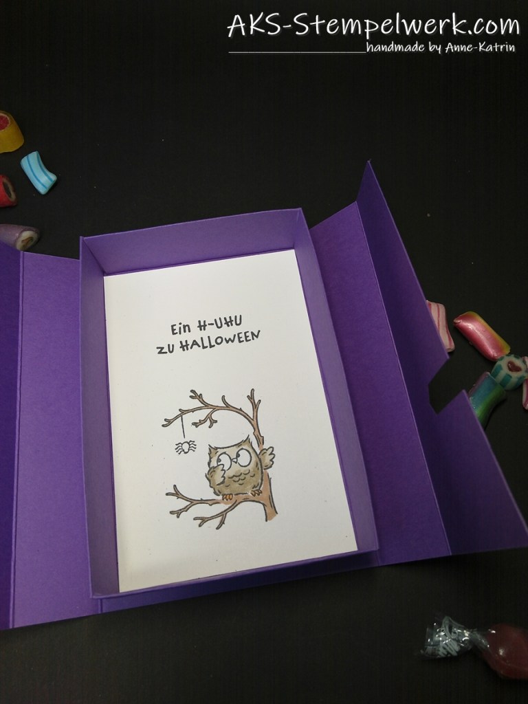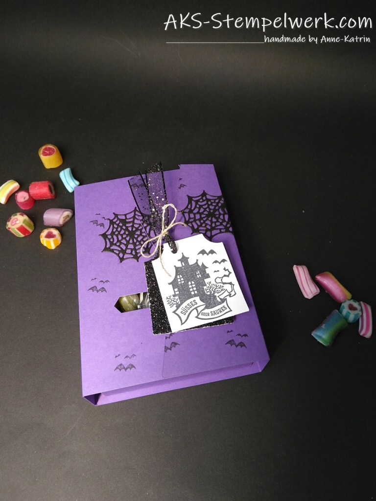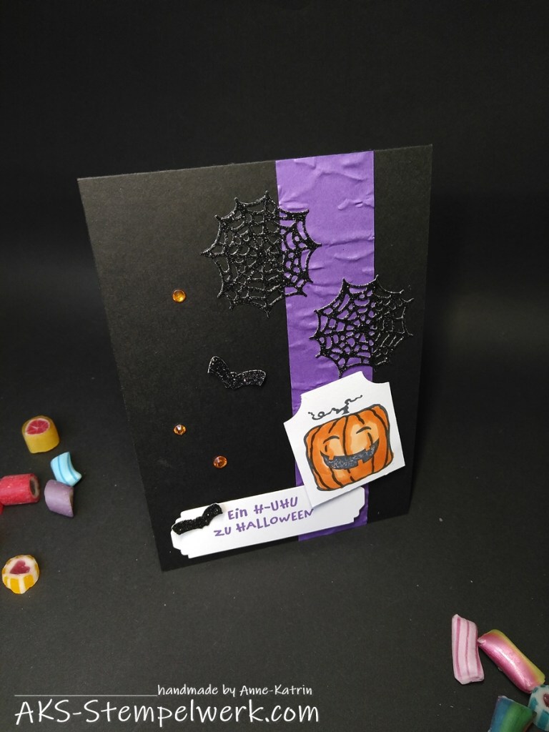 Auf der Karte habe ich für den lila Streifen die Prägeform „Antikes Papier“ (Hauptkatalog S. 185) hervorgekramt. Die Spinnennetze sind diesmal aus dem schwarzen Glitzerpapier gestanzt (Herbst-Winterkatalog S. 53), genauso wie die Fledermäuse.