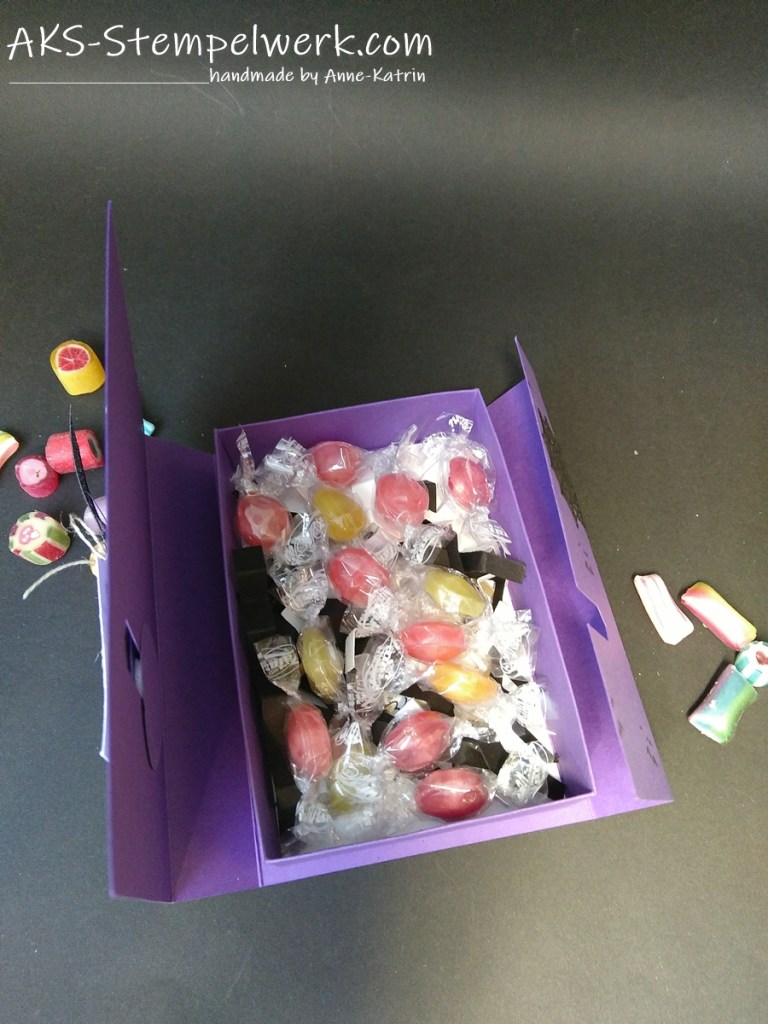 Gefüllt ist die Box natürlich mit was Süßem, und zwar mit bunten Bonbons. Und als Clou gibt es auf dem Boden der Box noch eine kleine Botschaft 😉