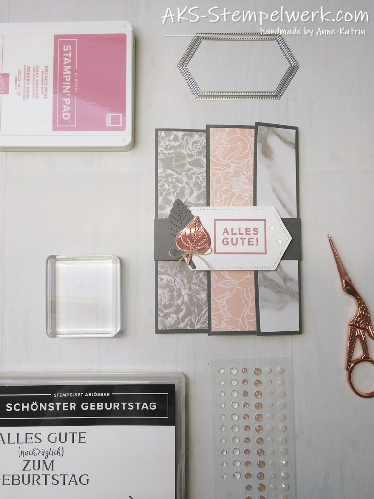 Gestempelt habe ich in rokokorosa und anthrazit. Die Kreise findet Ihr in dem Stempelset „Voller Schönheit“ (Hauptkatalog S. 77), das ich für solche Gelegenheiten gerne hernehme.