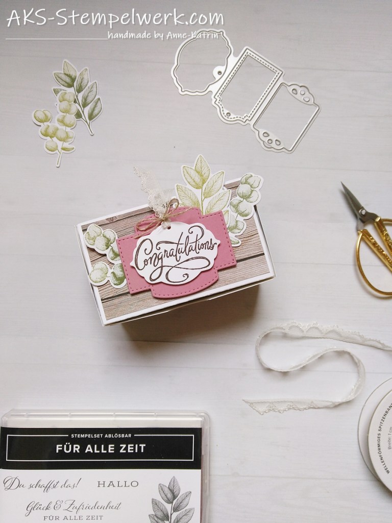 Der Deckel ist verziert mit einem Etikett in rokokorosa aus dem Stanzformenset „So hübsch bestickt“, darauf ein Anhänger aus dem Stanzset „Anhängertrio“ (Hauptkatalog S. 183), bestempelt mit dem Spruch aus dem dazu passenden Stempelset „Celebration of Tags“ (Hauptkatalog S. 53).