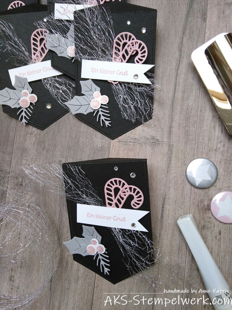 Ich finde es ganz angenehm, (noch) nicht im klassischen Weihnachtslook zu arbeiten und finde immer mehr Gefallen an dieser Farbkombi flüsterweiß, schiefergrau, kirschblüte und schwarz.