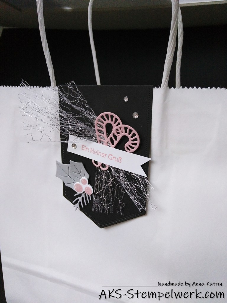 Diesmal sind die Stanzformen „Raffiniert bestickte Rahmen“ (Hauptkatalog S. 183) zum Einsatz gekommen für den schwarzen Anhänger.