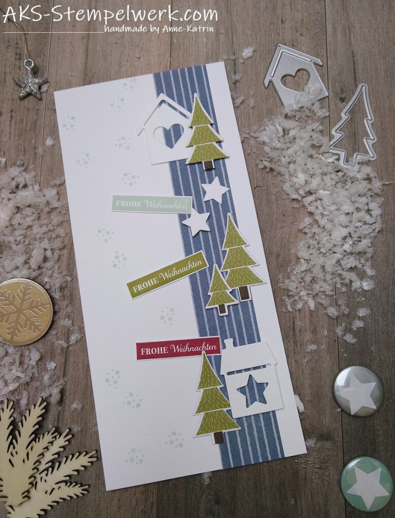 Endlich zeige ich Euch auch meine länglichen Kartenformate, denn neben meinen quadratischen Ausflügen in der letzten Zeit habe ich meine Weihnachtskarten vor allem in länglich und heute in hochkant ausprobiert. 😉