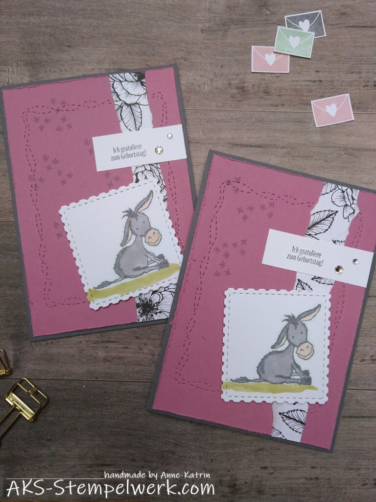 Als SAB-Set habe ich mich als erstes für das süße Eselset „Grüße auf 4 Hufen“ entschieden. Da sind auch der Spruch und die Sternchen im Hintergrund enthalten. Was will frau mehr?