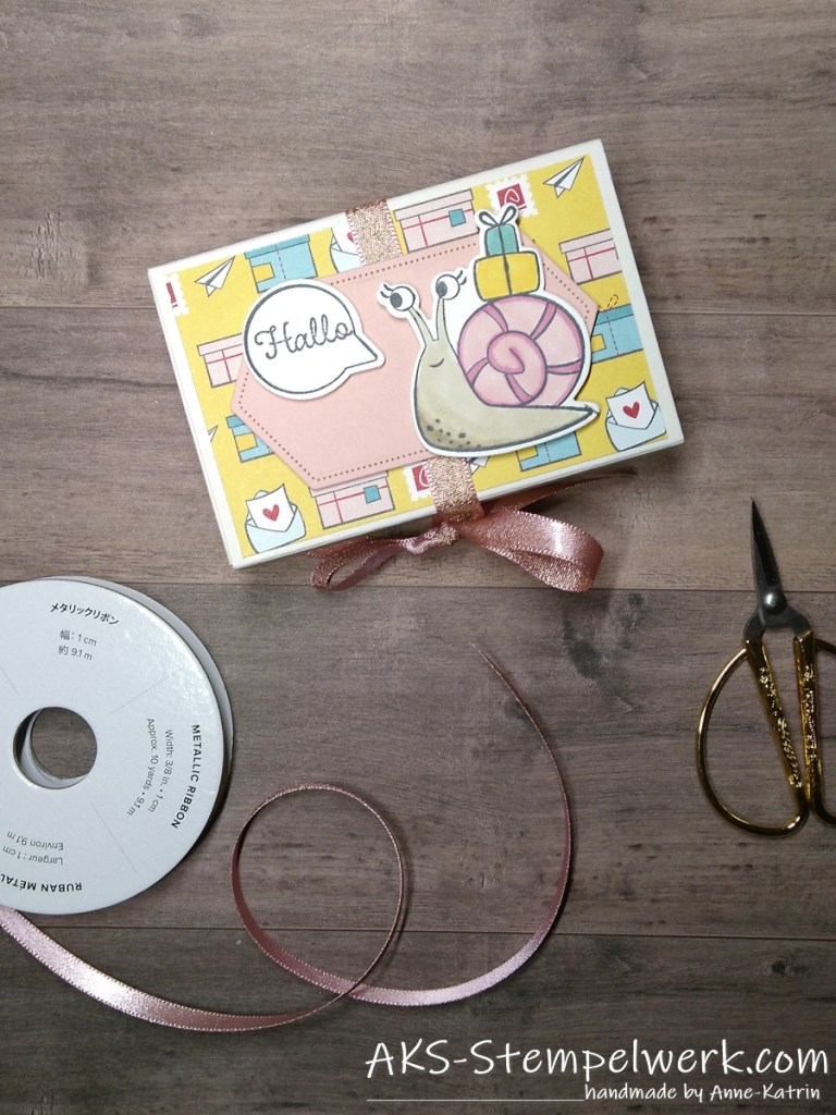 Mit dem passenden Designerpapier „per Schneckenpost“ (Minikatalog S. 55) habe ich die Leckereien-Schachteln (Minikatalog, S. 11) verziert. Das Papier bringt so richtig Farbe in unseren grauen Januar-Alltag.
