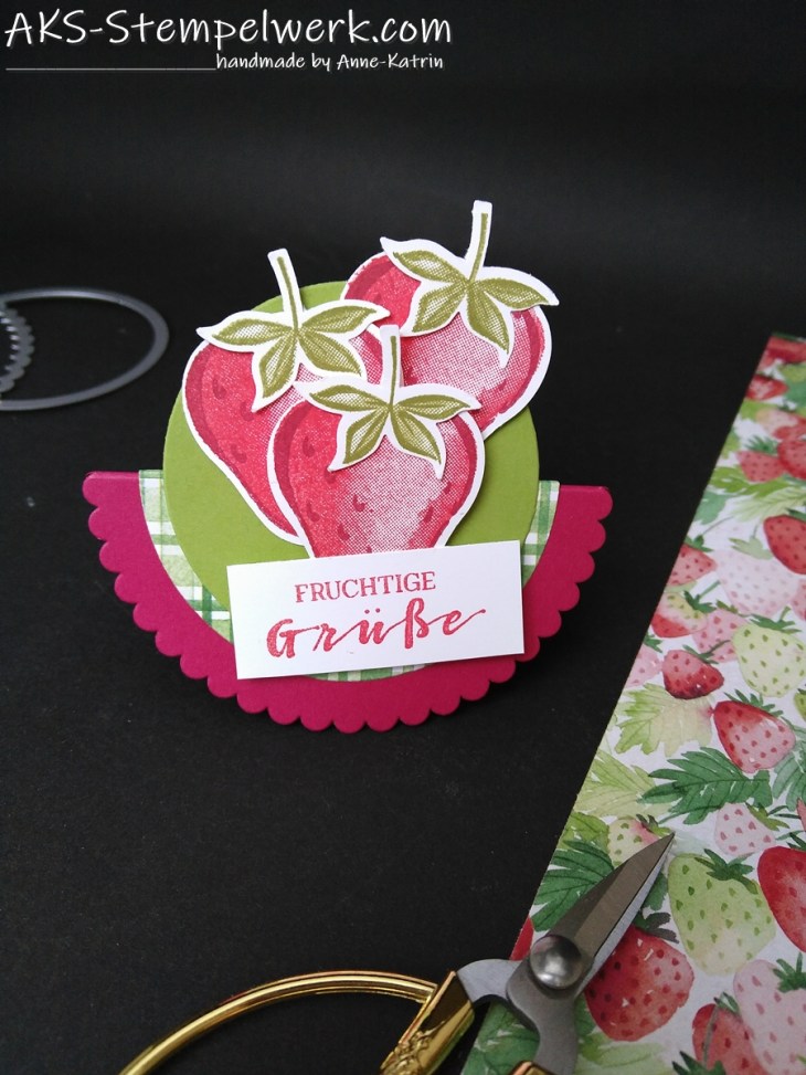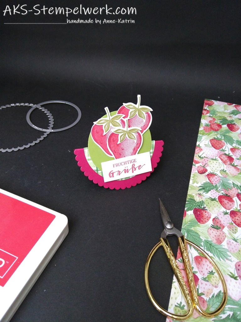 Stempel und Erdbeermotiv sind natürlich aus dem Set „Beerenstark“ (Minikatalog S. 44) und mit der passenden Handstanze „Erdbeere“ ausgestanzt.