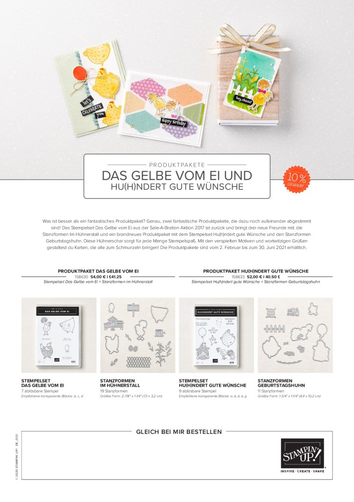 Bereits in der SAB 2017 gab es das Set „Das gelbe vom Ei“. Jetzt im Minikatalog auf S. 52 findet Ihr ein weiteres Set dieser lustigen Truppe, nämlich „Hu(h)ndert gute Wünsche“.