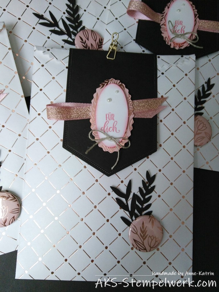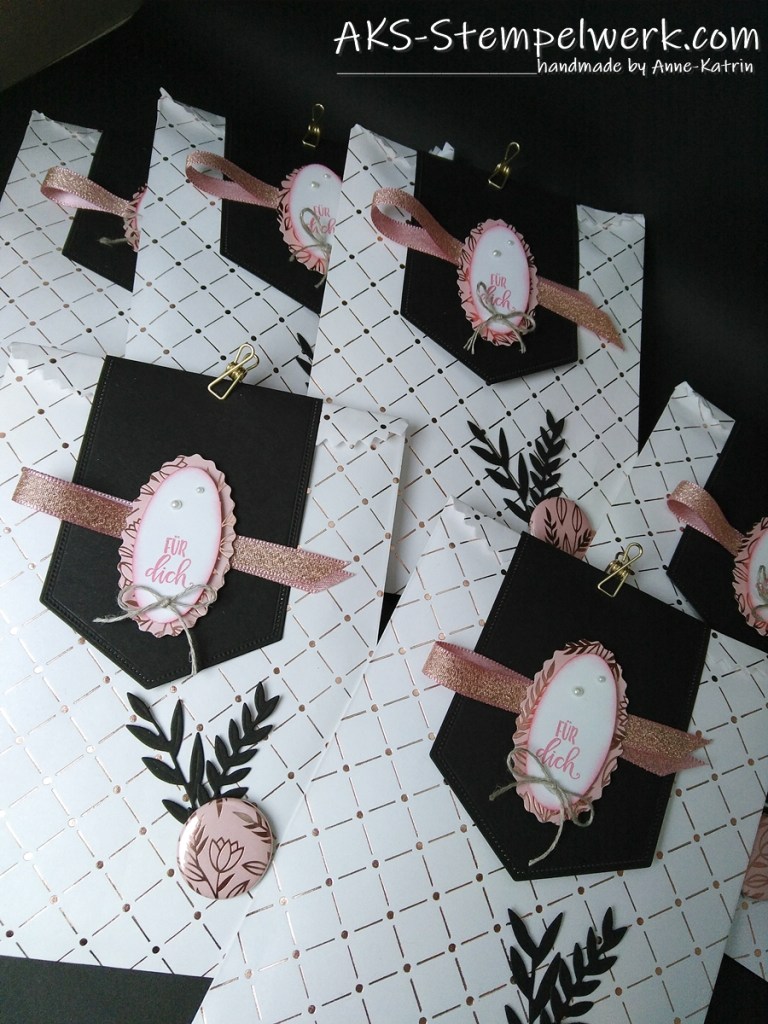 Diesmal habe ich ein paar alte SU-Tüten aus meinem Bestand (soooo schade, dass es die nicht mehr gibt 🙁 ) aufgehübscht, und zwar in der Farbkombi schwarz-weiß-gold und kirschblüte.