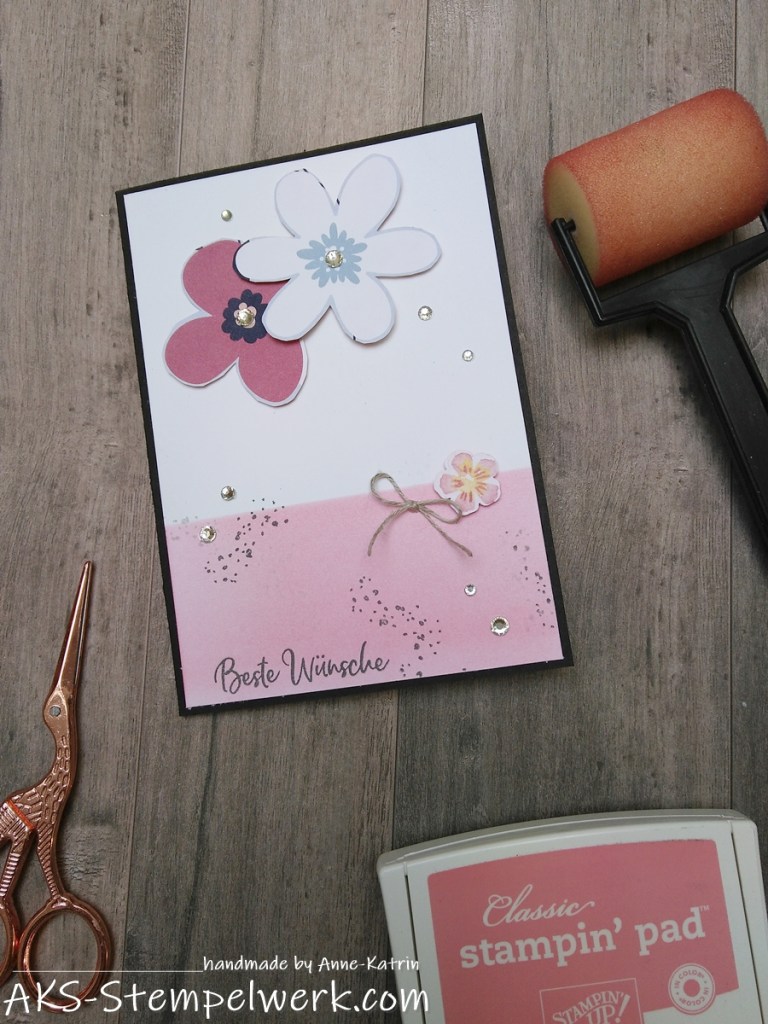 Hier sind u.a. die Blüten aus dem Designerpapier „Papierblüten“ aus der Sale-A-Bration zur Geltung gekommen. Ich habe sie ganz einfach mit unserer spitzen Papierschere ausgeschnitten und mit Gluedots und Dimensionals (3d-Pads) aufgeklebt.