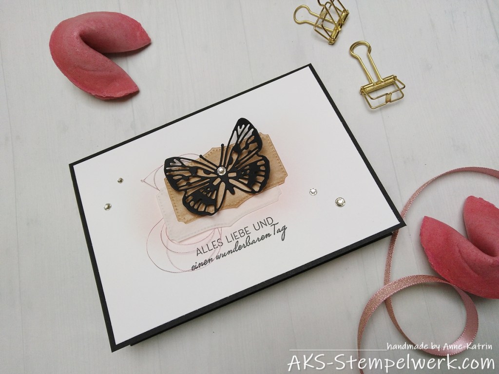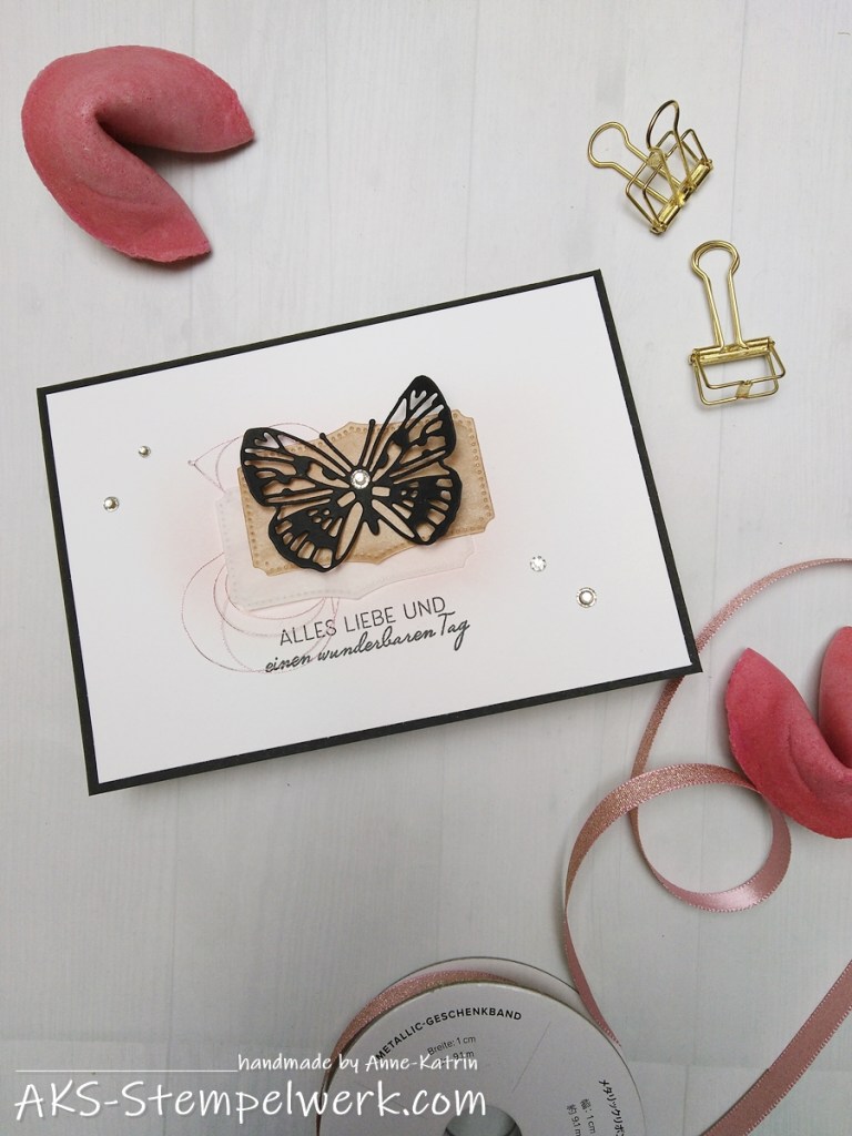 Der Schmetterling in schwarzem Cardstock ist natürlich aus dem aktuellen Aktionsset „Flügel voller Fantasie“. Das Designerpapier „Schmetterlingsschmuck“ ist übrigens exklusiv nur innerhalb dieser Aktion erhältlich (solange der Vorrat reicht).
