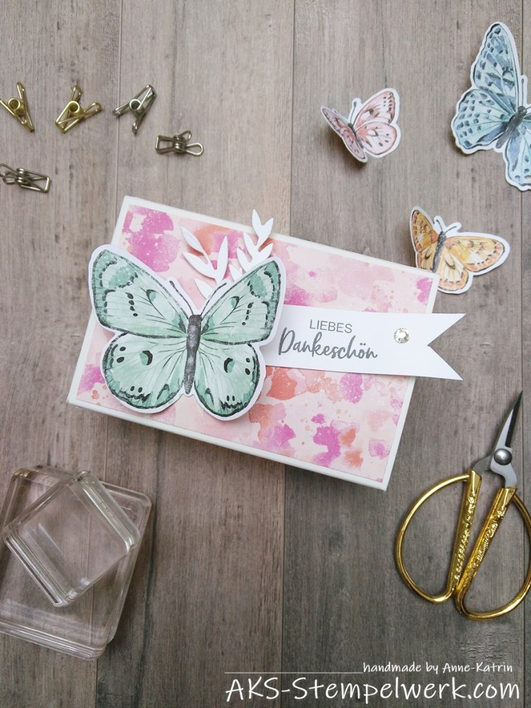 Hier habe ich die Box mit dem Designerpapier „Schmetterlingsschmuck“ aus der März-Aktion „Flügel voller Fantasie“ beklebt. Ihr seht nur die Draufsicht, aber das Papier könnt Ihr auch auf die Seiten kleben, das wirkt richtig schön bunt.