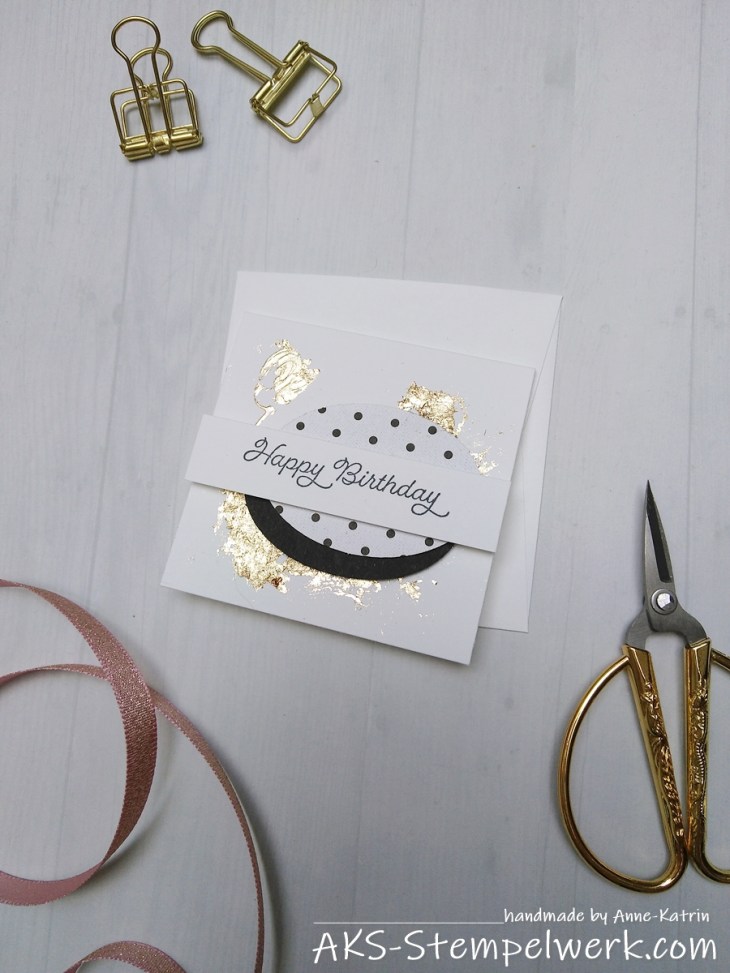 Für den goldenen Hintergrund habe ich die „Deko-Metallblättchen in gold“ (Minikatalog S. 33) verwendet, schwarzen Cardstock und Designerpapier (das ist noch von der Banderole der Box übrig geblieben 😉 )leicht versetzt übereinander geklebt und mit Dimensionals den bestempelten Streifen mit Happy Birthday in Kartenbreite aufgeklebt.