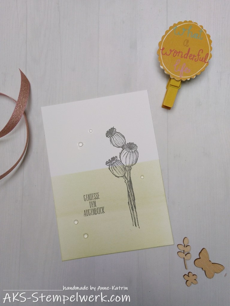 Bei der nächsten Karte habe ich das Stempelset „Ganz im Augenblick“ (Minikatalog S. 59) verwendet, mit dem ich zugegebenermaßen erst warm werden musste. Aber jetzt ist es mir sehr ans Herz gewachsen. 😍