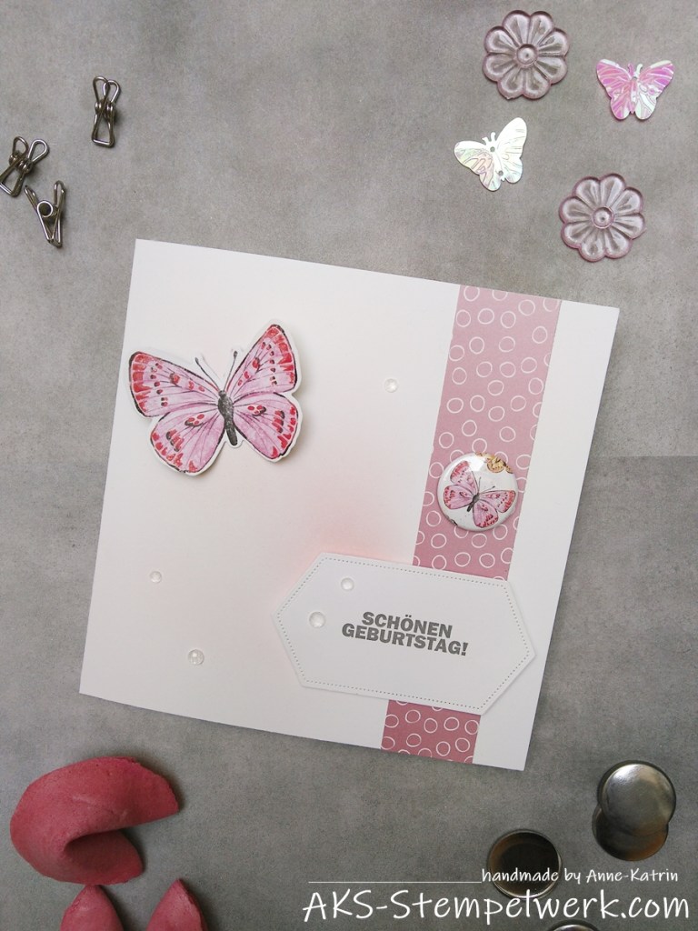 Die Schmetterlinge und das Designerpapier stammen aus der März-Aktion bzw. der letzten Sale-A-Bration. Auch der Spruch ist aus einem Sale-A-Bration-Stempelset, und zwar „So gut wie perfekt“. Aber auch, wenn Ihr diese Sets vielleicht nicht in Eurem Bestand habt, kann man das ja alles mit aktuellen Sets abwandeln 😉