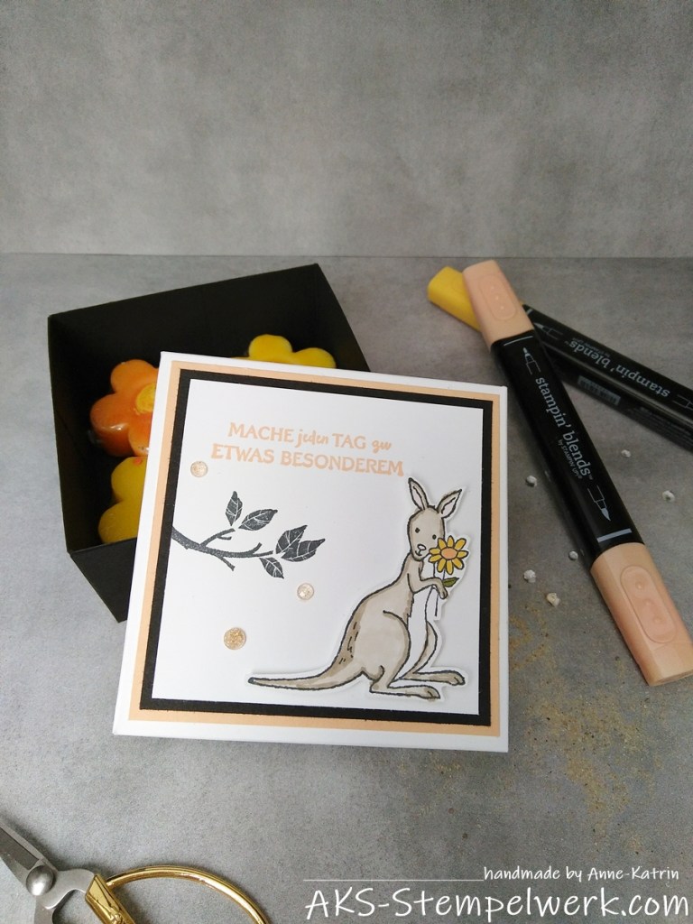 Dabei ist mal wieder das Stempelset „Count on me“ zum Einsatz gekommen. Diesmal habe ich das süße Känguruh coloriert, per Hand ausgeschnitten und mit Dimensionals aufgeklebt.