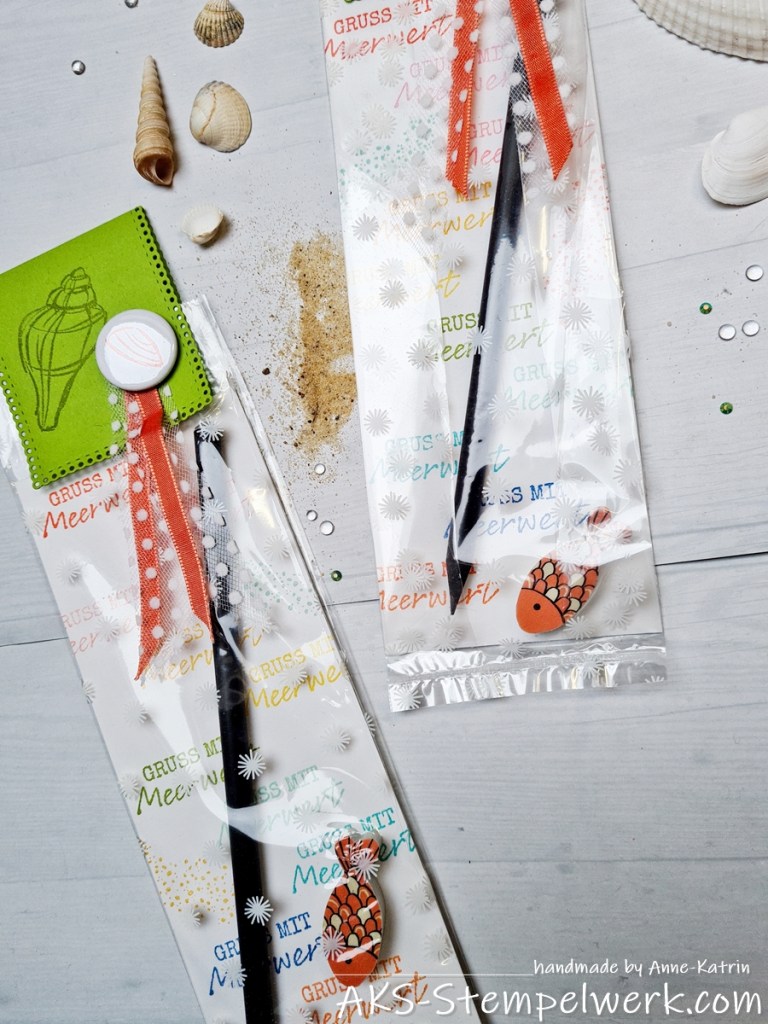 Verpackt habe ich jeweils einen Bleistift und ein kleines Radiergummi in Fischform.