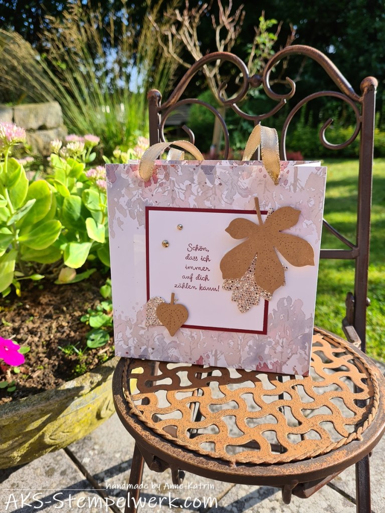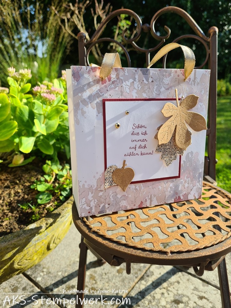 Eine herbstliche Verpackung sollte es diesmal sein und da ich zwar ein großer Taschenfan bin, aber schon wirklich lange keine mehr gewerkelt hatte, wurde es mal wieder Zeit für ein solches Täschchen: