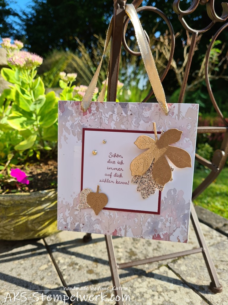 Der schöne Spruch stammt übrigens aus dem passenden Stempelset zu den Blätterstanzen „Wunderbare Blätter“ (Hauptkatalog S. 115) und ist in merlotrot gestempelt.