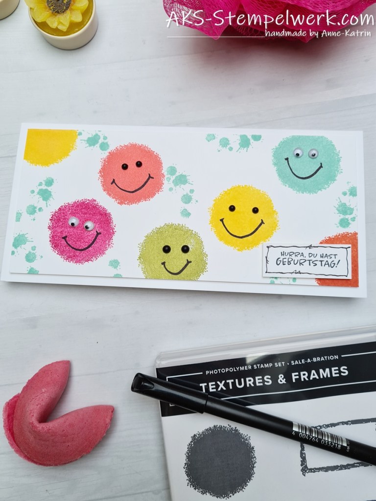 Ich liebe ja Stempelsets für die Hintergrundgestaltung und da fällt das SAB-Set „Textures and Frames“ definitiv drunter. Aber wer hätte gedacht, dass die Stempel nicht nur für den Hintergrund geeignet sind, sondern sogar die Hauptrolle auf einer Karte spielen können? 😉