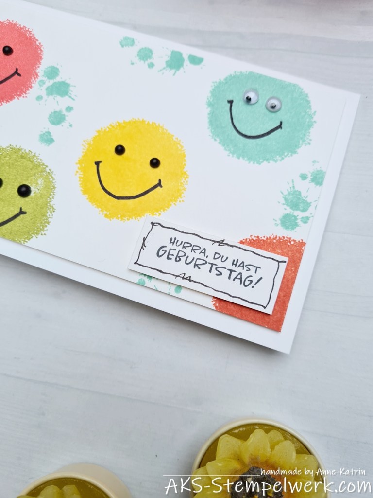 Die Idee mit den schwarzen Perlen als Augen für diese bunten „Flummis“ hab ich bei France Labrecque, einer Demokollegin aus Canada gesehen. Aber ich hatte noch ein paar Wackelaugen und finde die als Eyecatcher sogar noch ein bißchen lustiger. 😂
