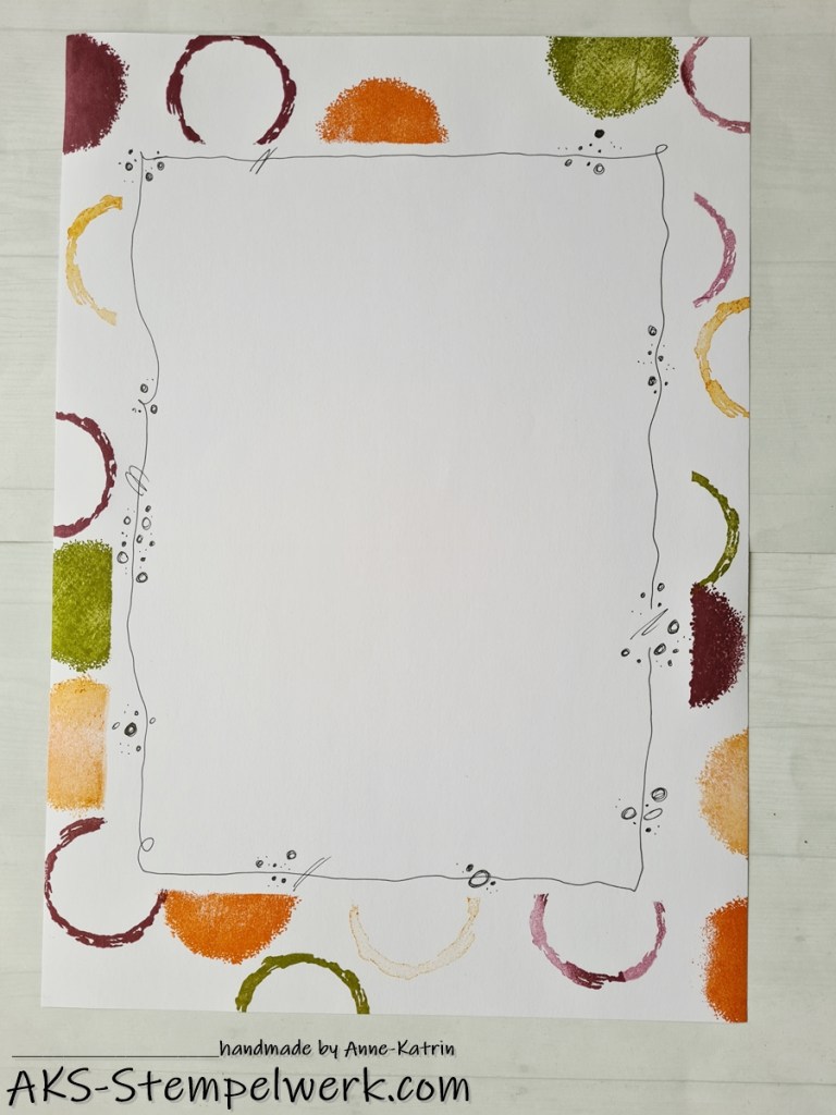 Innerhalb dieses gestempelten Rahmens habe ich dann mit einem schwarzen Fineliner wieder etwas gedoodelt und einen weiteren Rahmen gebildet. So ergibt sich nämlich ein schönes Schriftfeld für den Text, den man schreiben möchte.